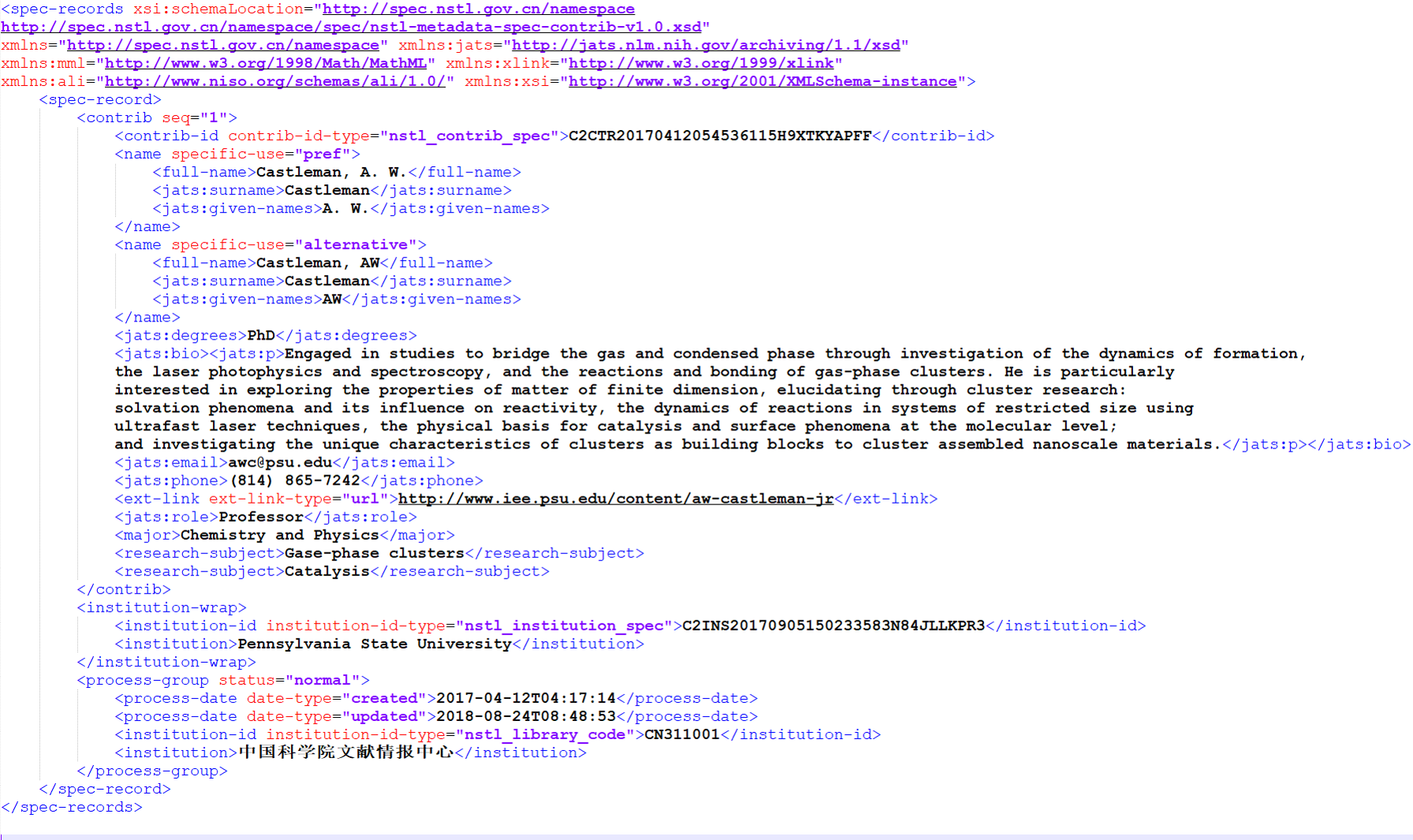 (1)在数据更新流转过程中,原始的institution-id、award-id、contrib-id很难稳定存在。故在名称规范元数据描述规范中,不再对上述原始id及其关系进行描述。
