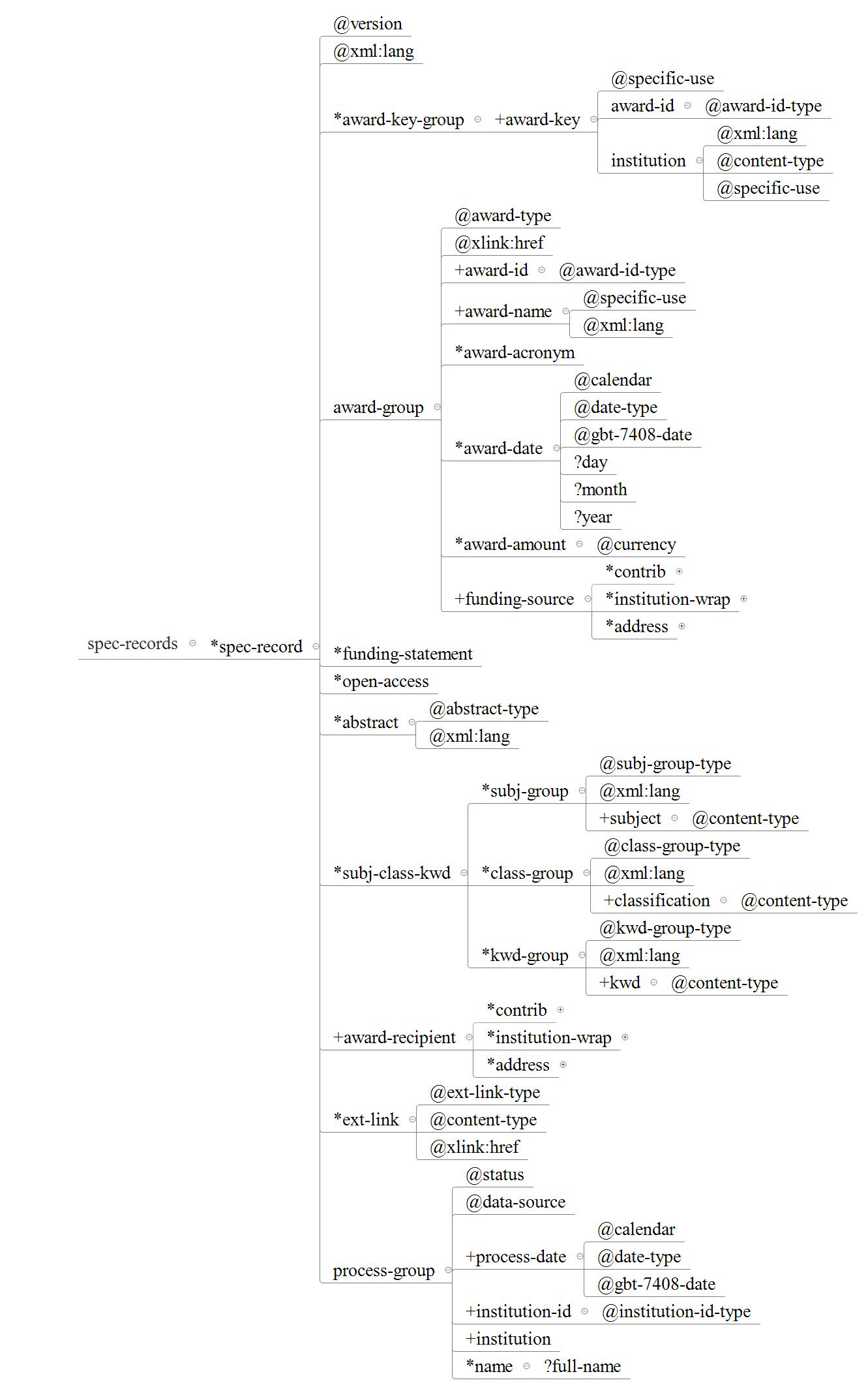 项目规范描述元数据包括项目规范信息描述和操作信息描述,复用统一文献元数据标准中的项目信息组(funding-group)、摘要(abstract)、主题/分类/关键词(subj-class-kwd)和操作信息(process-group),新增award-recipient元素集描述项目负责人和项目承担机构信息。如图3所示。