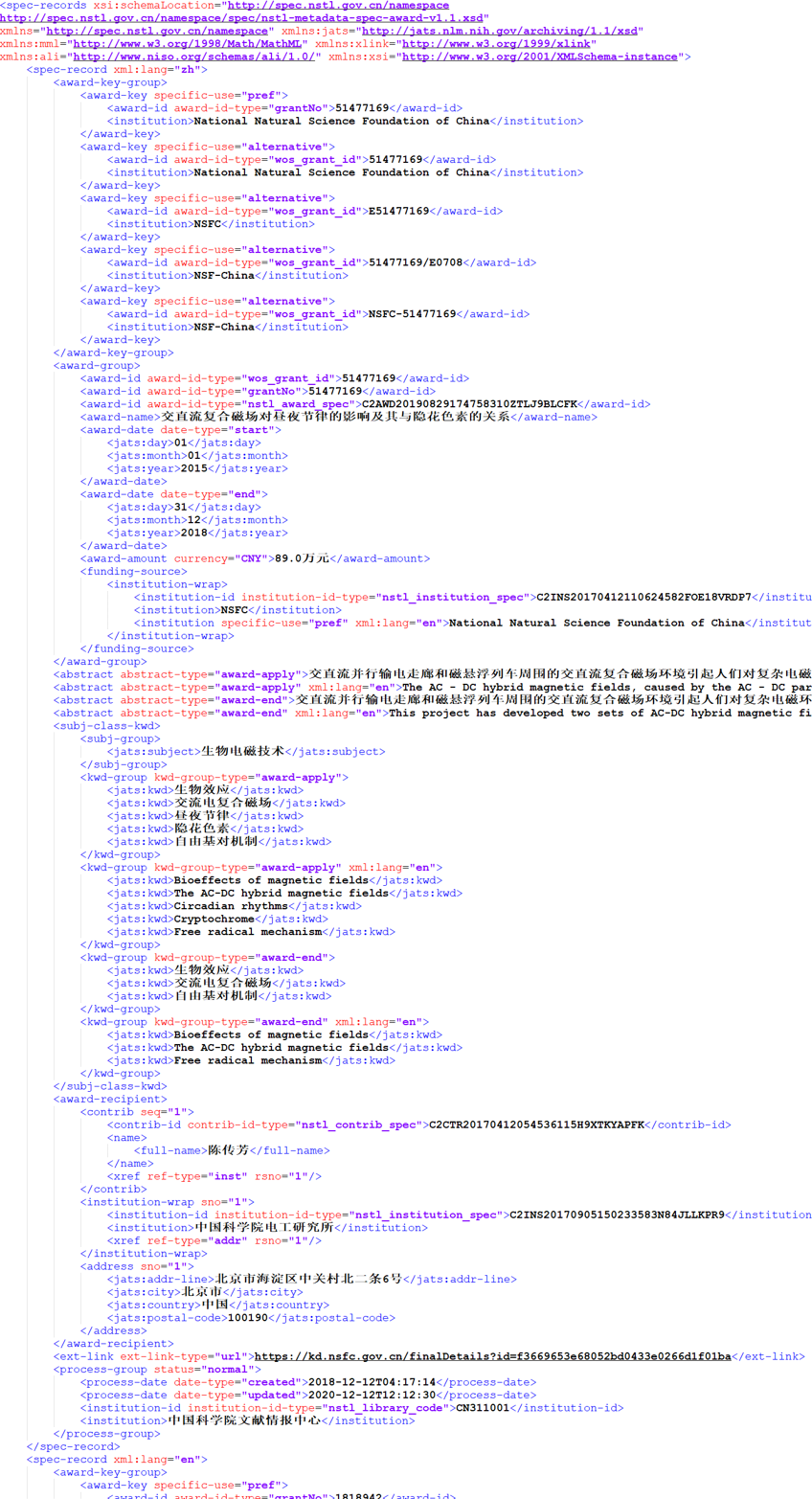 新增元素award-key对award-id、institution进行封装,通过award-key中的两个元素,实现多源项目数据的唯一识别。