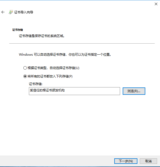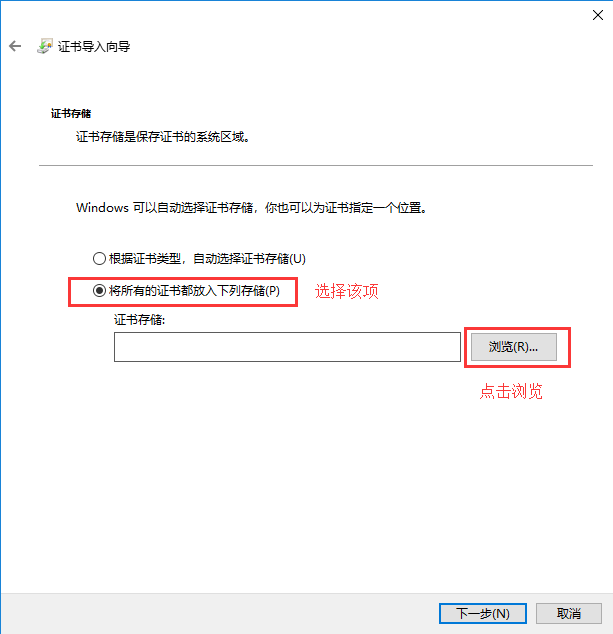 4、选择“将所有的证书都放入下列存储”,点击“浏览”